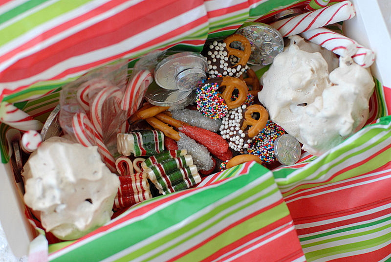Having some sweets to nosh always adds to the fun. I made up these treat boxes as a surprise for our car full. They included mini candy canes, peppermint sticks (great for stirring hot chocolate though we usually have that in travel mugs), Forgotten Cookies , chocolate 'coins', vintage style ribbon candy made locally by Hammond's Candy and a delicious and easy favorite: chocolate dipped pretzels. Chocolate dipped pretzels are so quick and simple to make and you can really make them to fit your personal tastes. Everything in this box is easy and quick to prepare so great for outings or gifts.