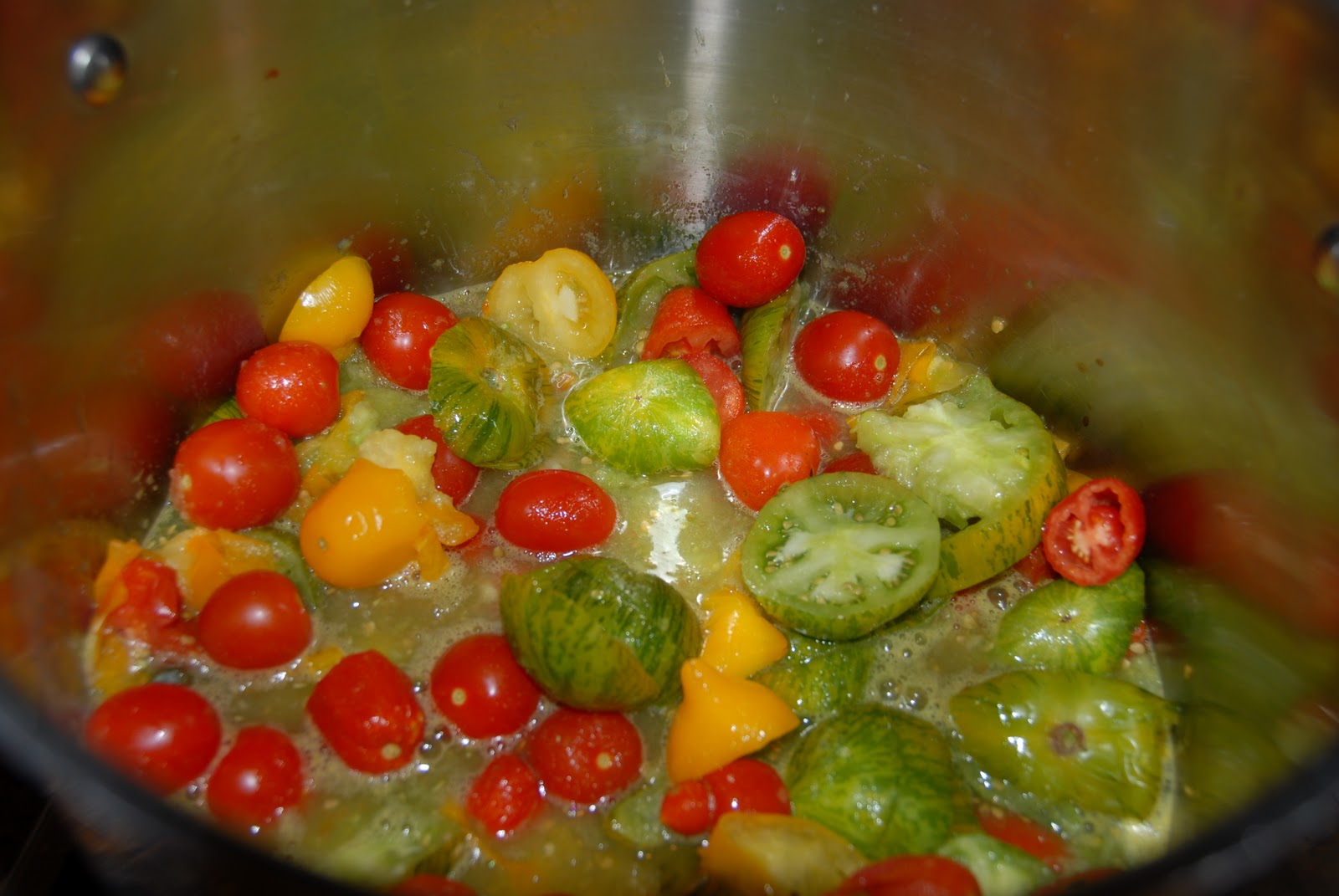 Before doing so I carefully picked all ripe tomatoes, peppers and drying bean pods in the event my scheme failed. The volume of my harvest left me wondering what to do to celebrate this probable end to the summer growing season. I decided to make a simple tomato soup. I combined the beautiful Green Zebra heirlooms with the Yellow Plum, San Marzano romas, cherry tomatoes from an elementary school experiment into a gorgeous mélange of color and flavor.