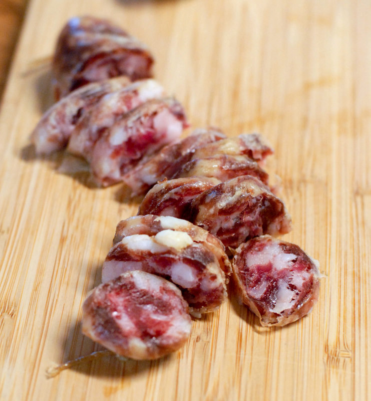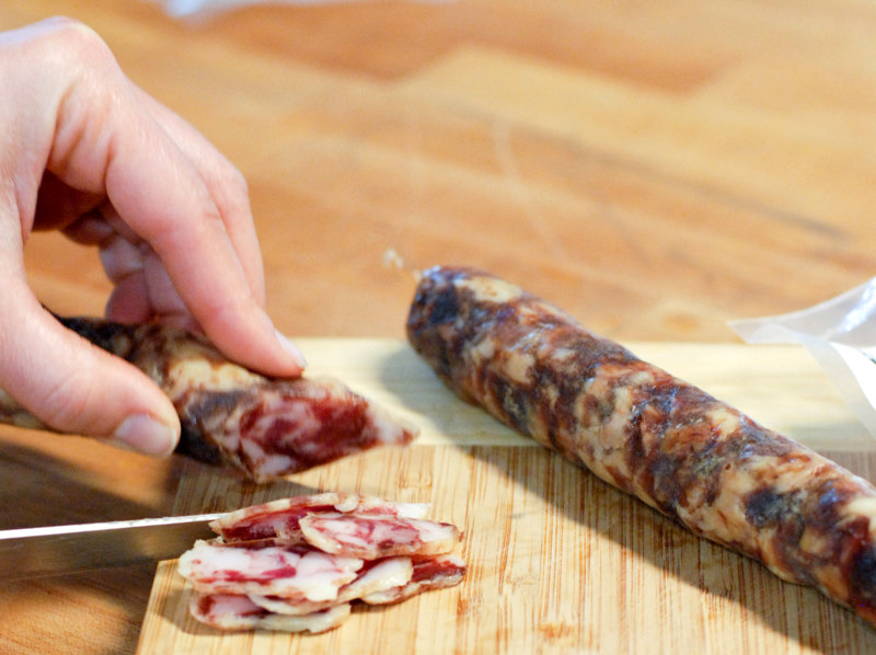When Anne sliced the Saucisse Sec in 'normal size' slices, Paul commented they were 'way too big'. This sausage should be sliced paper thin.