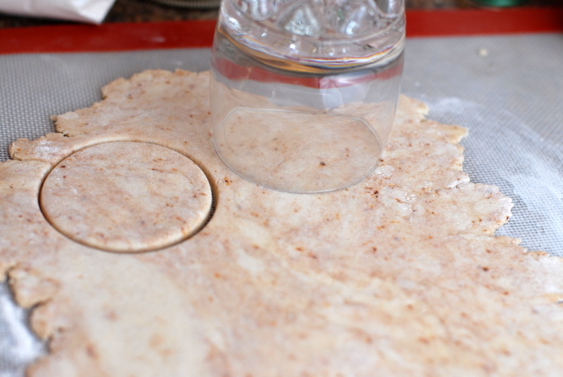 2. Remove the dough from the refrigerator. Split it into two pieces for ease of rolling, and roll it out onto a lightly floured surface. Roll to about 1/8th inch thick. Using a round cookie cutter or the mouth of a glass, cut out circles about 3-4 inches in diameter.