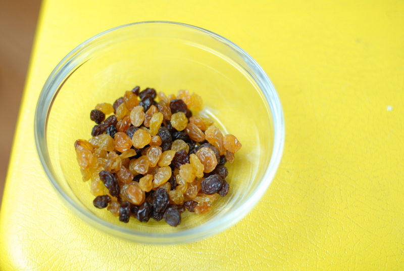 - Place the raisins in a heat proof bowl. Pour boiling water on them just to cover them and add 1 teaspoon of Calvados. Cover and let sit.