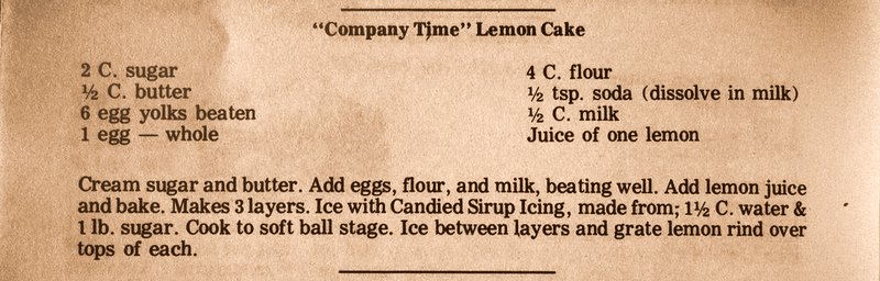 Last month I participated in my first vintage recipe redo and swap after prompting from blogger 'Gal Pal' Christianna who had picked up a great vintage hymnal at an Arizona Swap Meet. This month more have joined in the fun and the recipe chosen was 'Company Time' Lemon Cake.