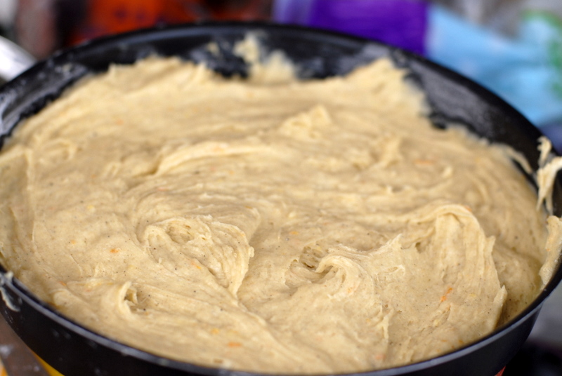 4. Beat in flour, xanthan gum, baking soda, baking powder, cardamom and salt. As you are beating add the orange juice. Batter will be thicker more like a bread batter. You can add more milk or juice if you want it to be more liquid.