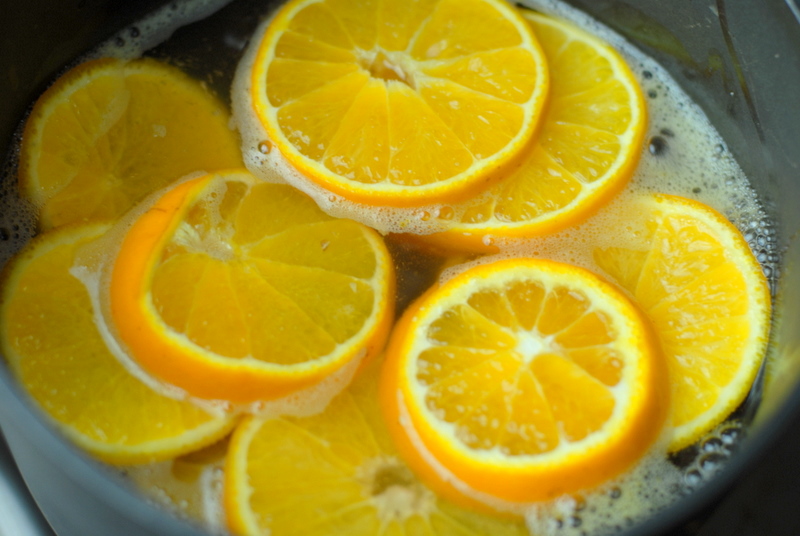 1. Combine water and sugar in a saucepan until sugar is dissolved. Add orange slices and heat over medium heat until reaching a boil (about 15 minutes).