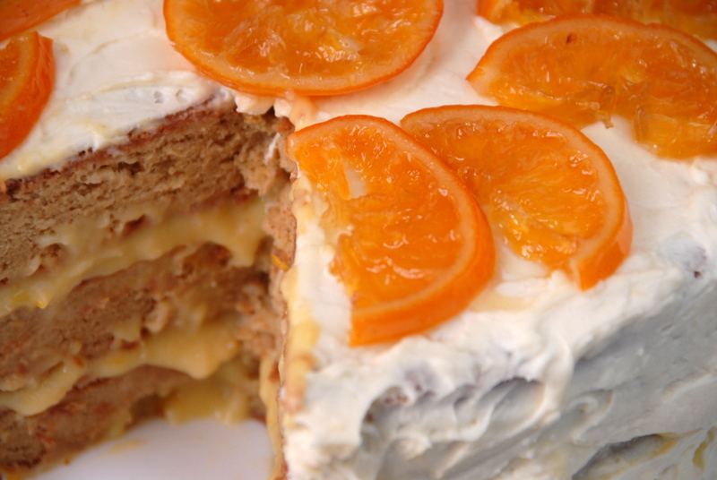 Gluten Free Orange Cardamom Cake with Orange Curd Filling and Cream Cheese-Cointreau Frosting and Candied Oranges