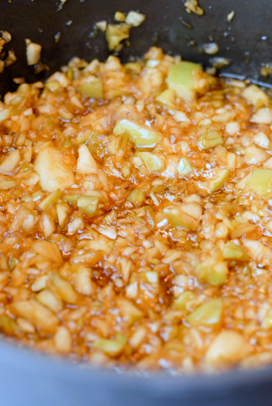 3. Stir in the apples. When you do, the sugar may become thready and solid. Keep stirring and it will melt again. After totally liquid again cook 5 more minutes until apples are soft.
